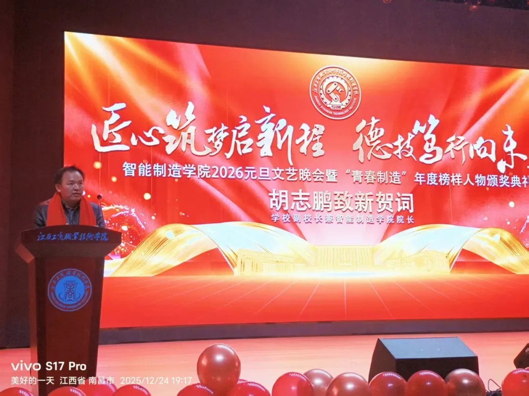 昨夜星光灿烂,今宵掌声不息。12月24日晚,智能制造学院“跨越新元,奔赴新愿”2026元旦文艺晚会暨青春智能制造年度榜样人物颁奖典礼在学校大礼堂隆重举行。师生欢聚一堂,共迎新年,见证荣耀,放飞梦想。