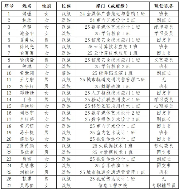 信息工程学院党支部于2026年4月1日召开支委会,经支部委员会考察研究,同意吸收游瑾、林欣等27名同志到为入党积极分子。为发扬民主,广泛听取党内外群众意见,接受广大党员群众监督,现将游瑾、林欣等27名同志的情况公示如下: