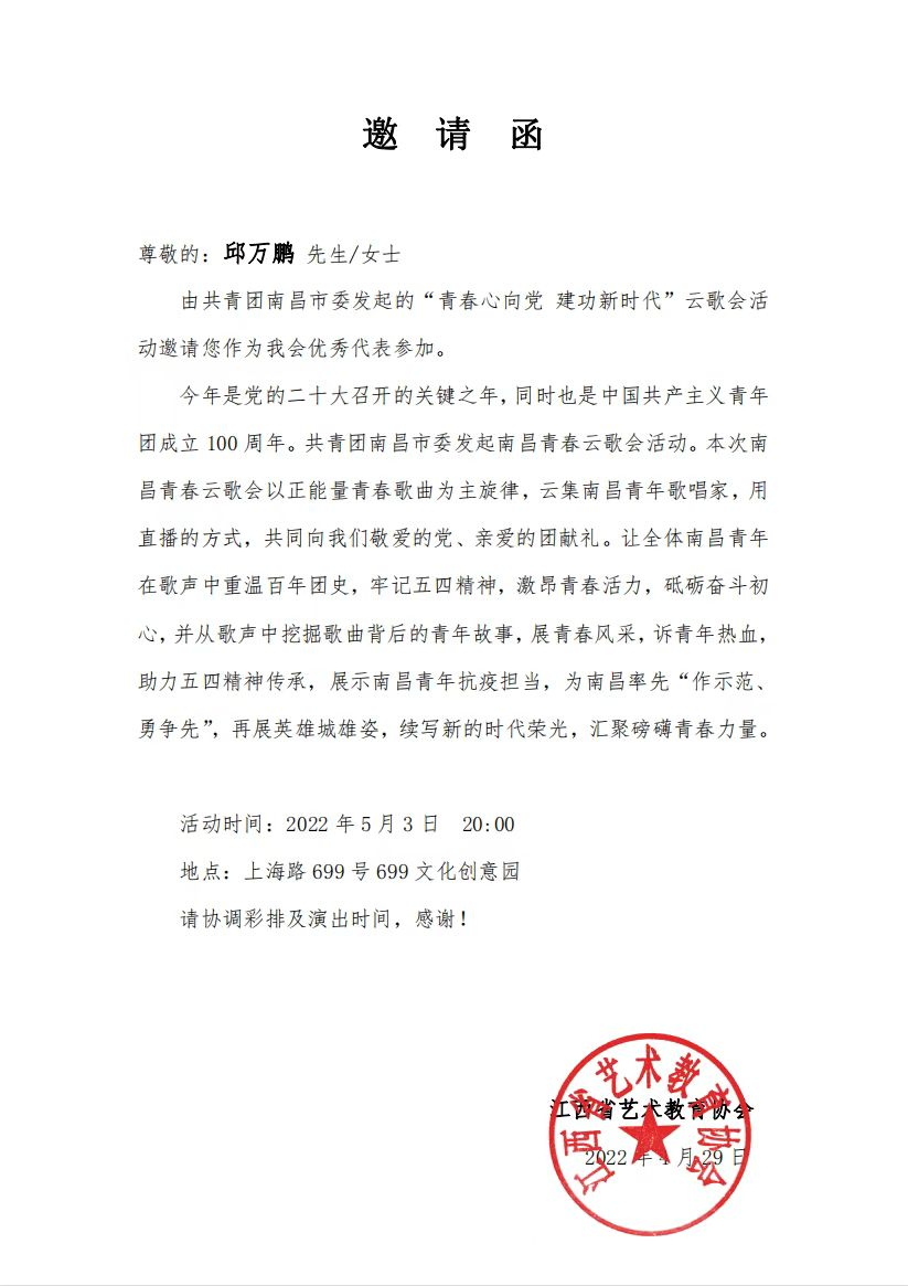 202253参演中共南昌市委宣传部共青团南昌市委举办的“青春心向党 建功新时代”线上音乐会独唱歌曲南昌南昌》;